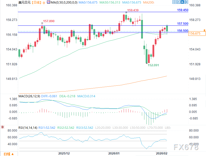 汇通财经APP讯——周一(2月9日)欧盘时段,美元兑日元早盘冲高后回落,当前价格在分时均线下方震荡,交投于156.592/604,跌幅0.39%。